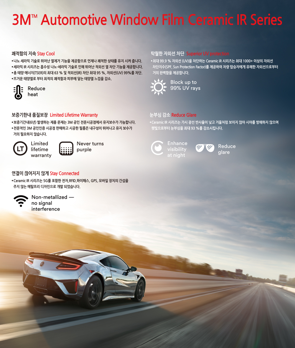 Ceramic IR Series는 나노 세라믹 기술로 최고 등급의 열(적외선 IR)및 자외선(UV) 차단 기능 제공으로 자외선은 최대 99% 차단, 총 태양 에너지의 최대 63 %, 열(적외선 IR)은 최대 95%를 차단하여 차량실내를 항상 쾌적한 환경으로 유지시켜줍니다.